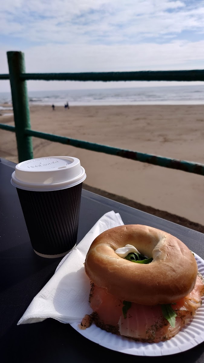 The sea view is a defining feature here—tables positioned near the promenade look out over the beach and the distant lighthouse, creating a setting that naturally invites a slower pace. Whether you’re up early to catch the sunrise or stopping by for a quick caffeine hit, the blend of salty air and gentle tide sounds works as a quiet backdrop for anyone wanting to unwind or watch the world go by.